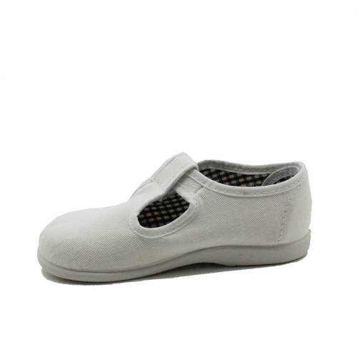 Pepito de lona con cierre de hebilla y suela de goma al tono. La horma viene grande, pero puede encoger un poco al lavarse.  Para lavar la lona, use un programa corto de lavadora, sin mucho centrifugado y con agua fría. Deje secar al aire, sin acercar a ninguna fuente de calor.