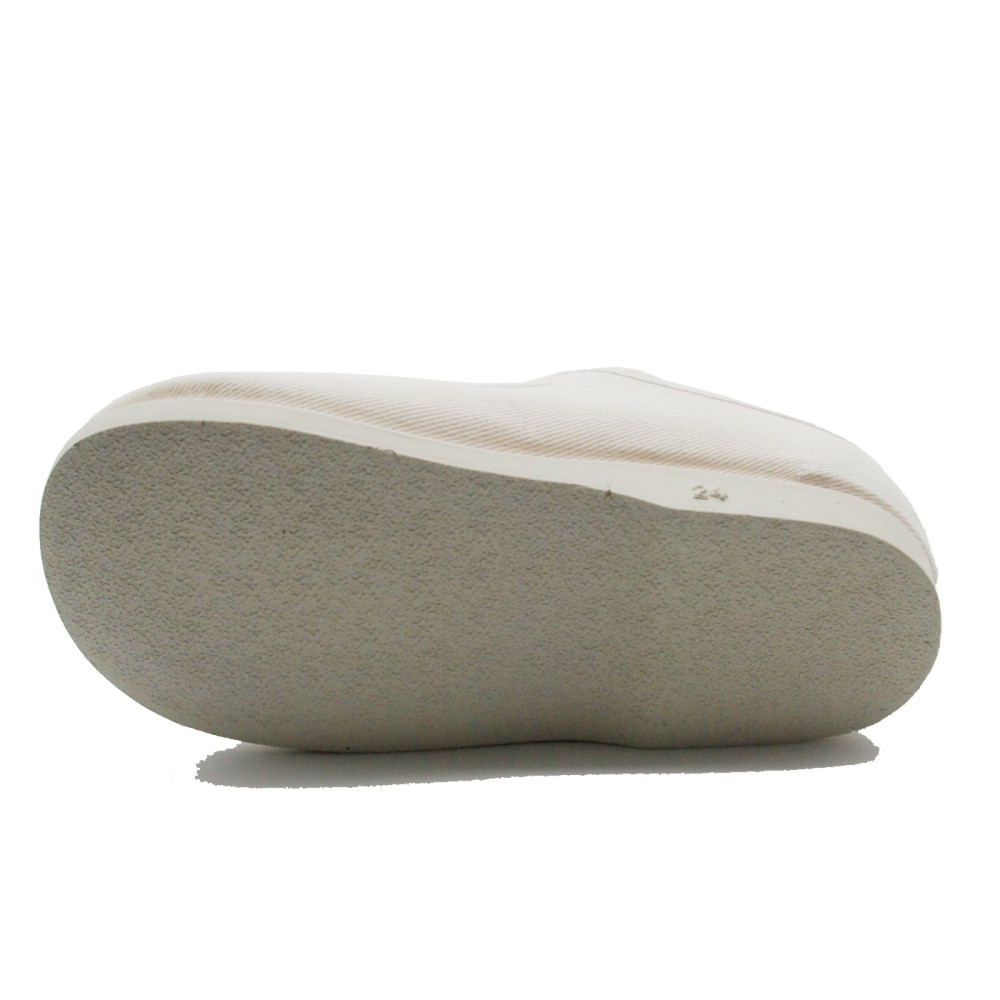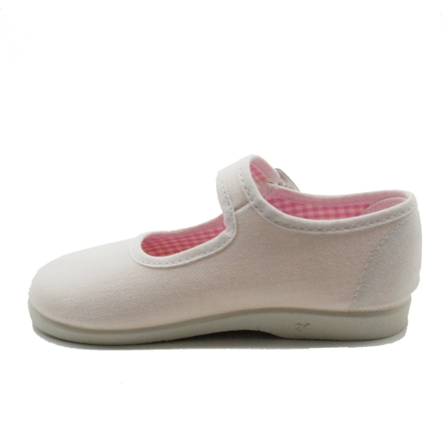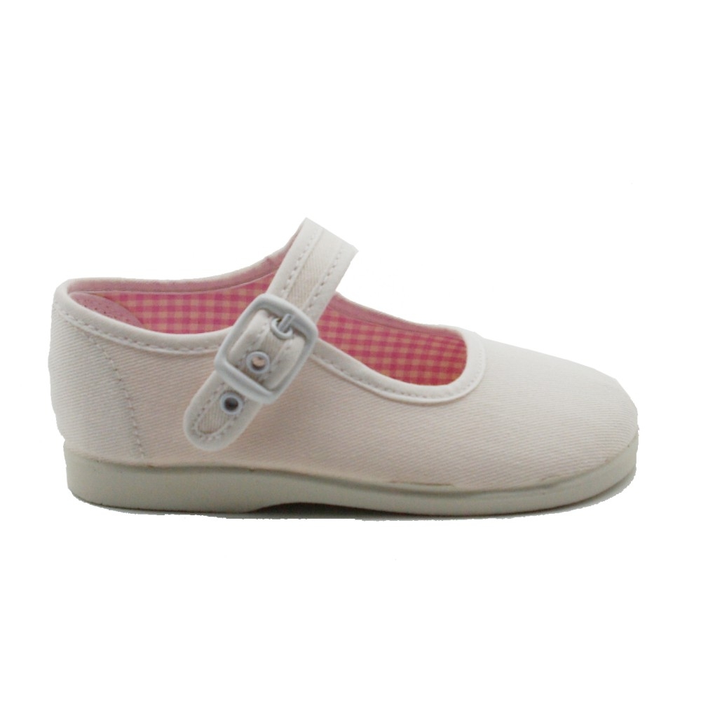 Mercedita de lona con cierre de hebilla y suela de goma al tono. La horma viene grande, pero puede encoger un poco al lavarse.  Para lavar la lona, use un programa corto de lavadora, sin mucho centrifugado y con agua fría. Deje secar al aire, sin acercar a ninguna fuente de calor.